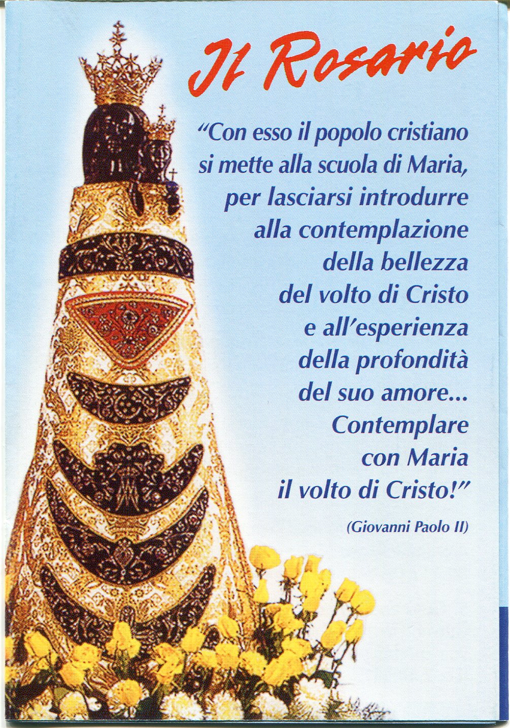 O Signore Gesù, che per giungere alla glorificazione hai voluto prima vivere una esistenza umana intessuta, come la nostra, di gioie e di dolori, fa che nella tua Chiesa non vengano mai a mancare ferventi Sacerdoti, Religiosi e Laici che col Rosario di Maria trasmettano agli uomini i misteri della nostra redenzione. Tu che vivi e regni nei secoli dei secoli.